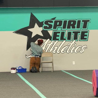I also returned to local gym, Spirit Elite Athletics to paint their logo. Last year I painted their windows and now with their brand new wall in place and ready to go, it needed their logo.