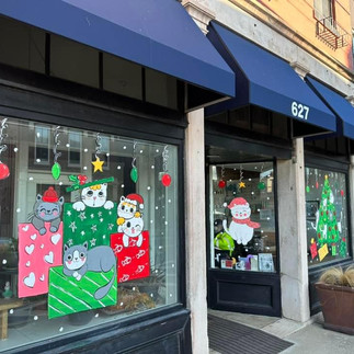 Murals don't just have to be for walls! The last couple of holiday seasons, I've started painting windows. If you have a business and you want to jazz up your window display or maybe you don't have the wall space to commit to a mural, painting your windows is the next best thing. This year I returned to the Cat Clinic in Louisville, KY to create a little Catmas and I also painted the Chestnut Market windows in downtown Corydon with a little nostalgia vintage collection of Christmas images.